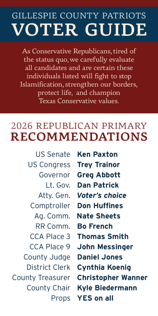 For more information contact us at info@gillespiecountypatriots.com.